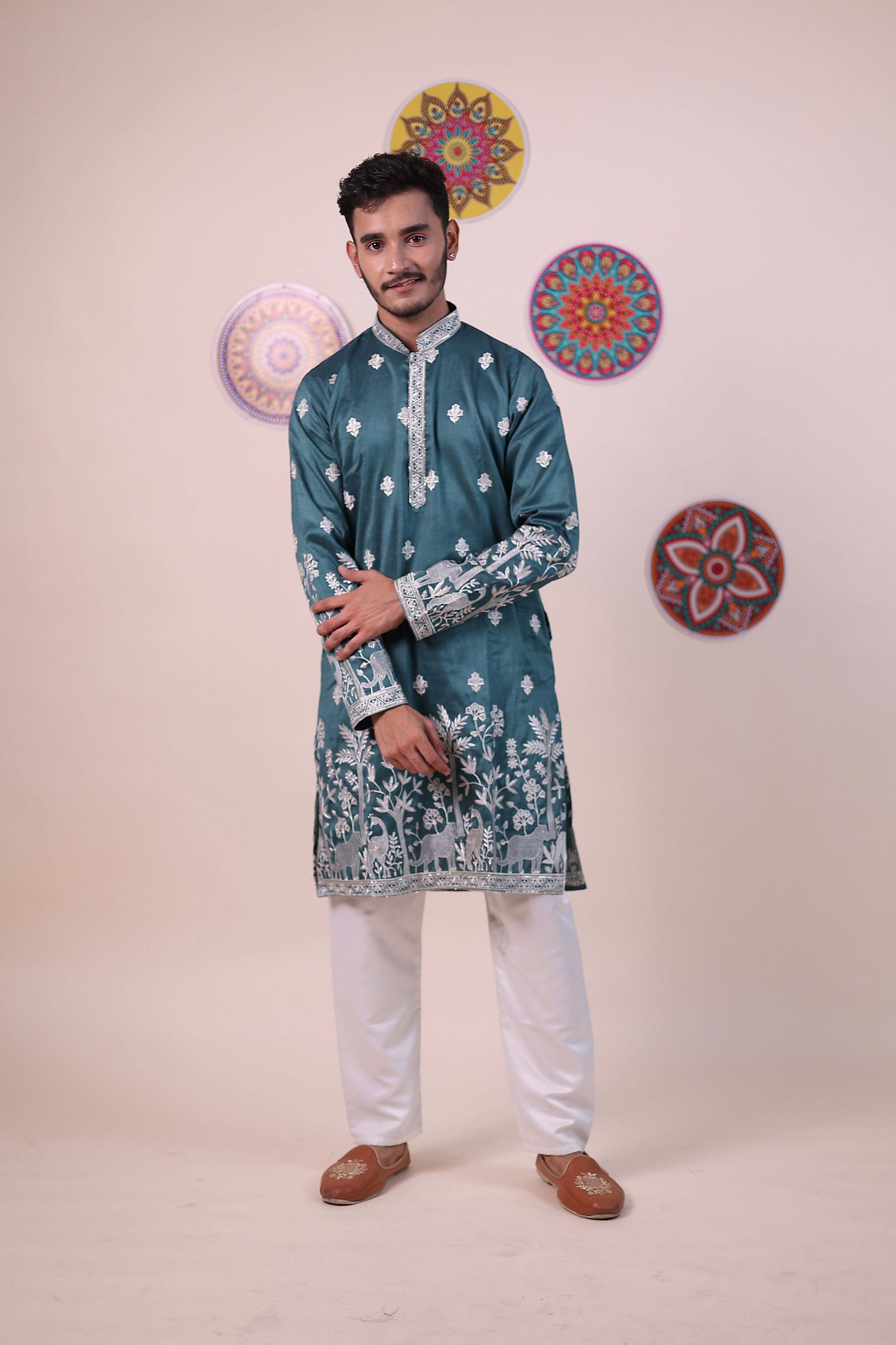 Celebrate tradition with a touch of nature in this emerald green kurta pajama set. The kurta is adorned with exquisite white embroidery featuring intricate patterns of trees, peacocks, and elephants along the hem and cuffs, bringing a unique cultural and artistic charm. A classic mandarin collar with detailed embroidery along the button placket elevates its traditional appeal. The straight-cut silhouette and white pajama bottoms ensure both comfort and style, making it an ideal choice for festive occasions, weddings, and cultural events where you want to stand out with grace and elegance.